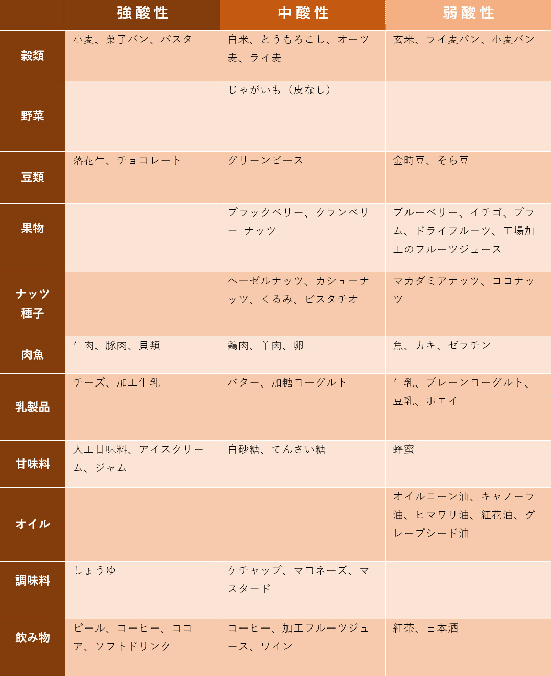 なるべく強酸性よりも中酸性、それより弱酸性という順になります。尚、アルカリ性の食品を摂るよう心がけましょう。
